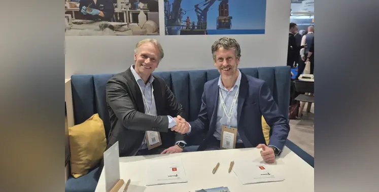 Mark Heine, Fugro CEO, (left) and Auden Berg, EVP, Kongsberg Discovery, sign the agreement at Oceanology International. (Image source: Kongsberg Discovery)