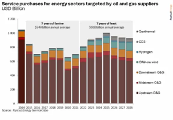 The global market for oil and gas contractors is expected to rise to a peak of US$1 trillion in 2025 and remain at high levels for several years thereafter, according to Rystad Energy