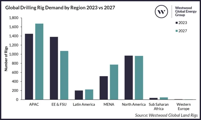 Demand from the Gulf Cooperation Council (GCC) countries is forecast to boost MENA land rig demand by almost 50% from 2023-2027, according to the latest edition of Westwood Global Energy Group’s World Land Drilling Rig Market Forecast.